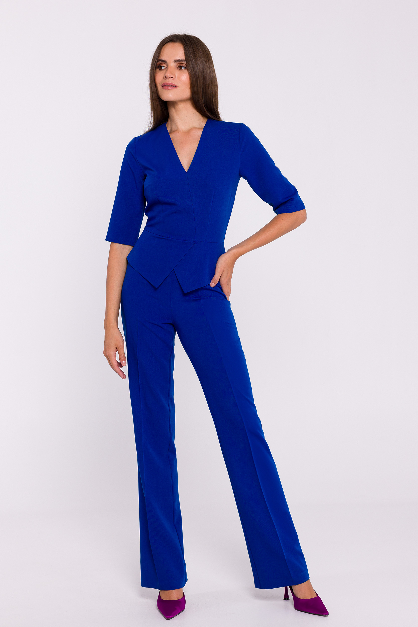 • nogawki zaprasowane na kant i poszerzone u dołu