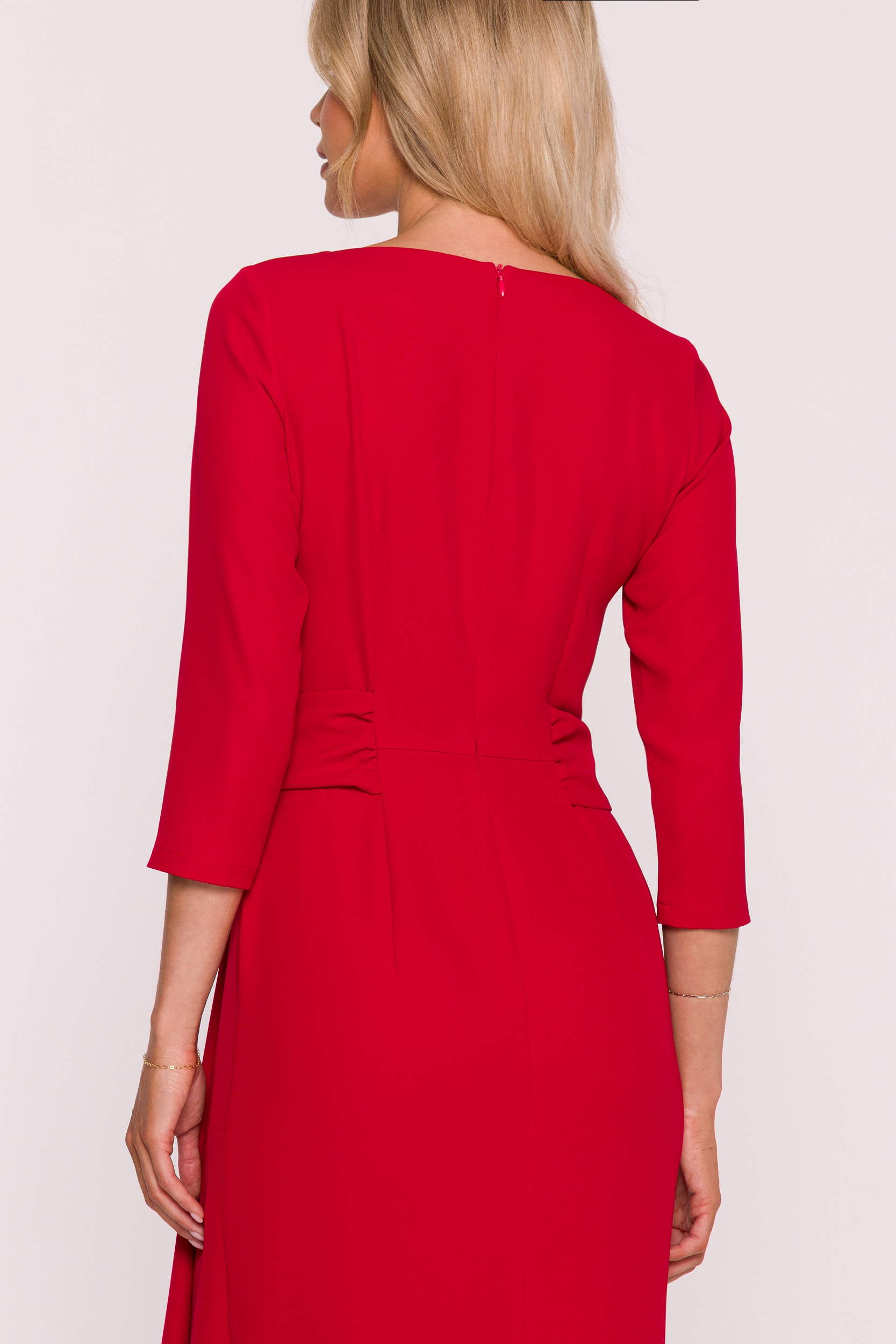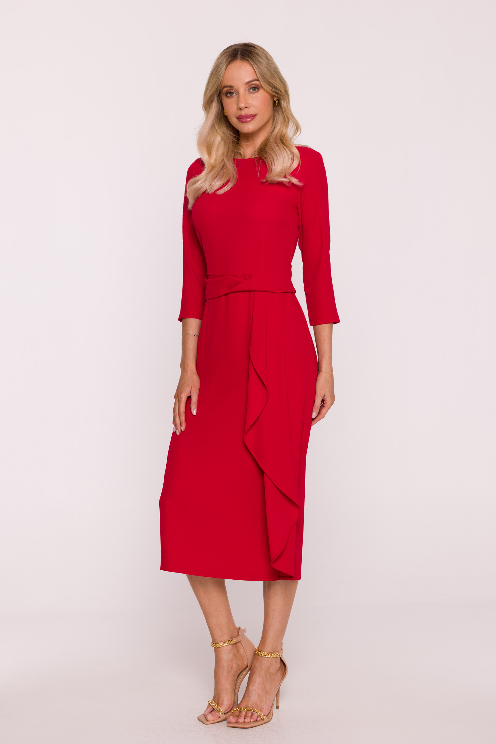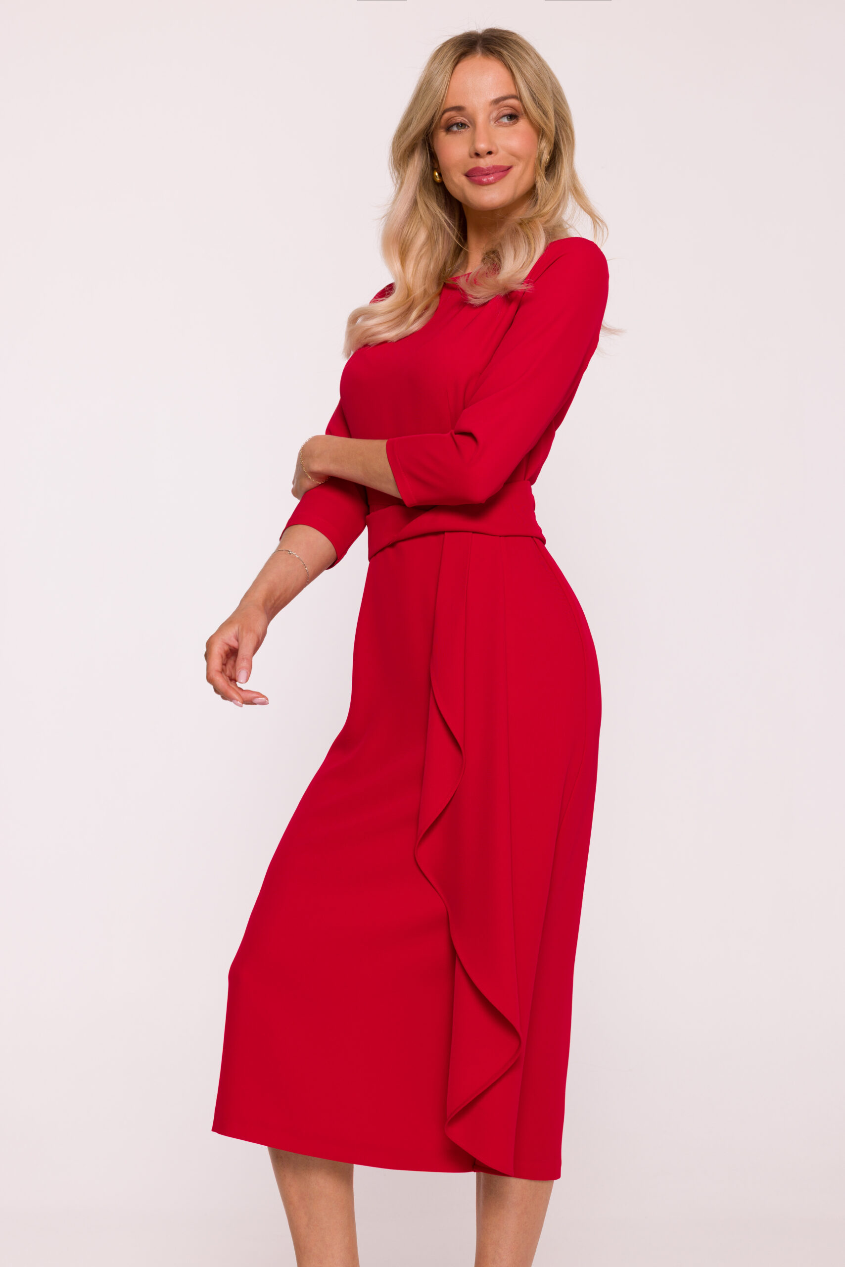 Szykowna sukienka midi z rękawem 3/4 i dekoracyjną falbaną to propozycja idealna na przyjęcia, spotkania biznesowe oraz uroczystości rodzinne. Jej elegancki charakter w połączeniu z wygodnym krojem gwarantuje stylowy wygląd w każdej sytuacji.
