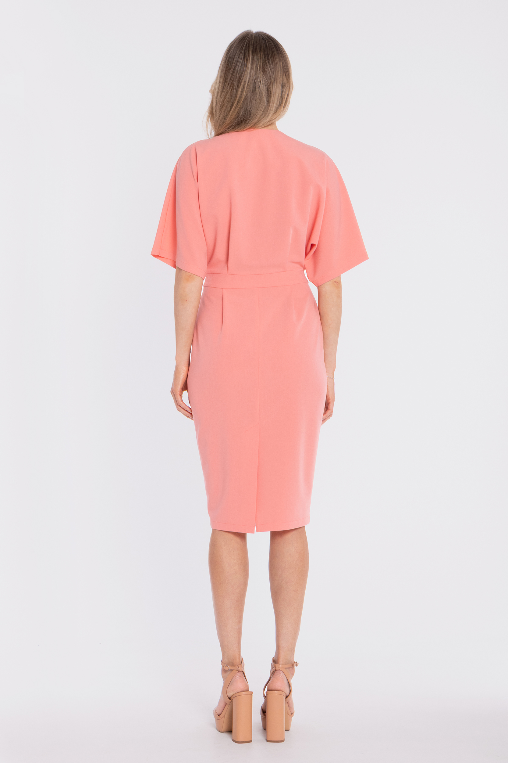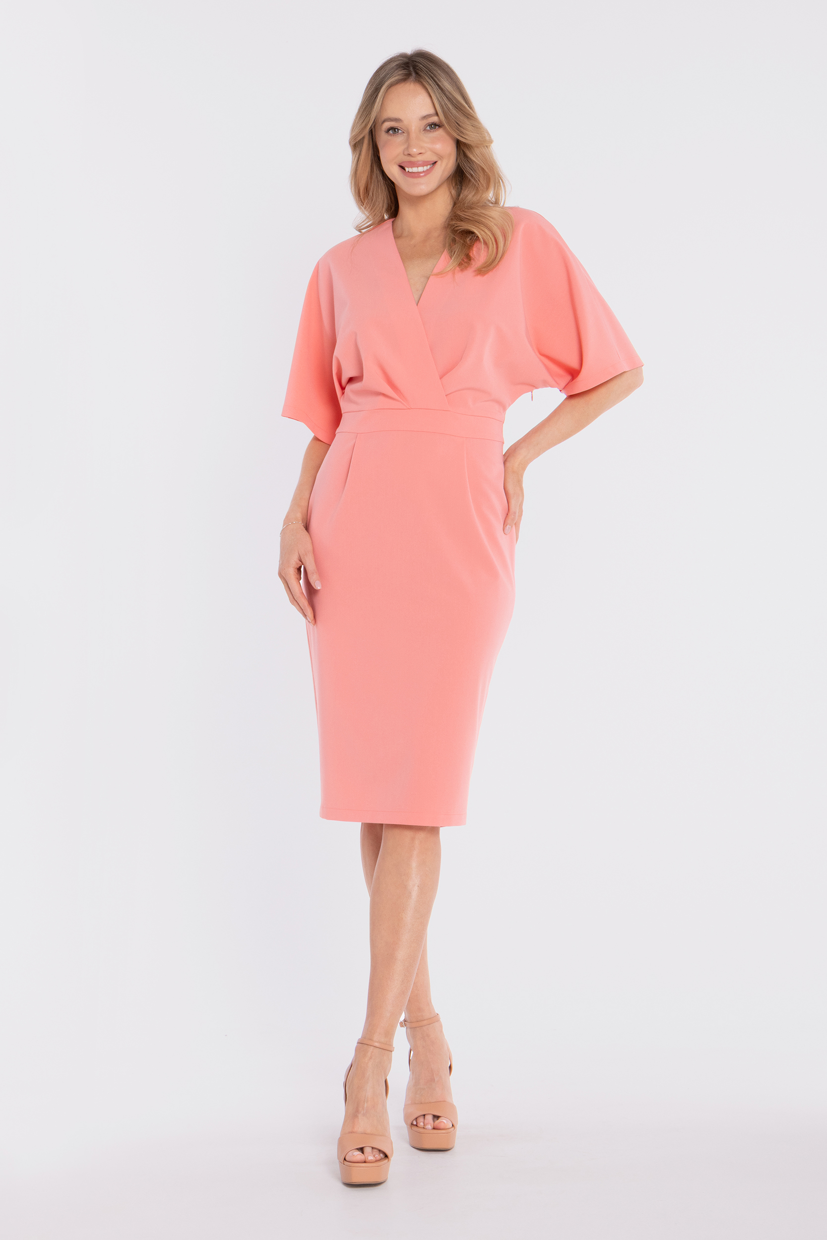 Fason: elegancka sukienka midi o kopertowej górze i ołówkowym dole.