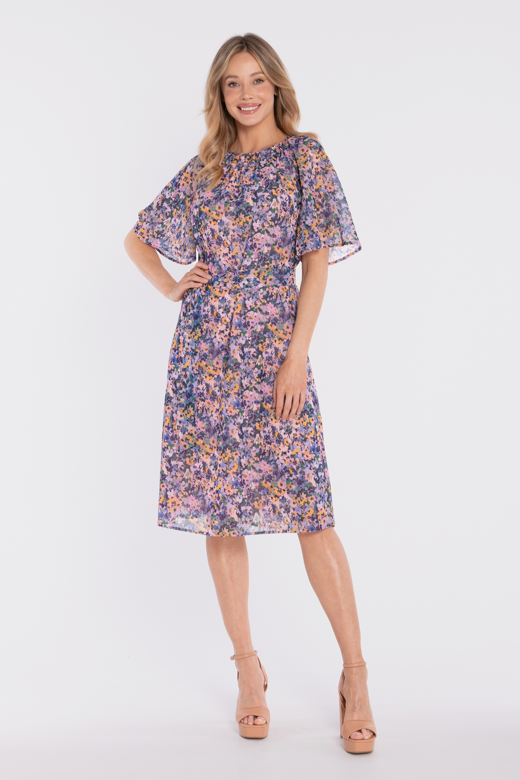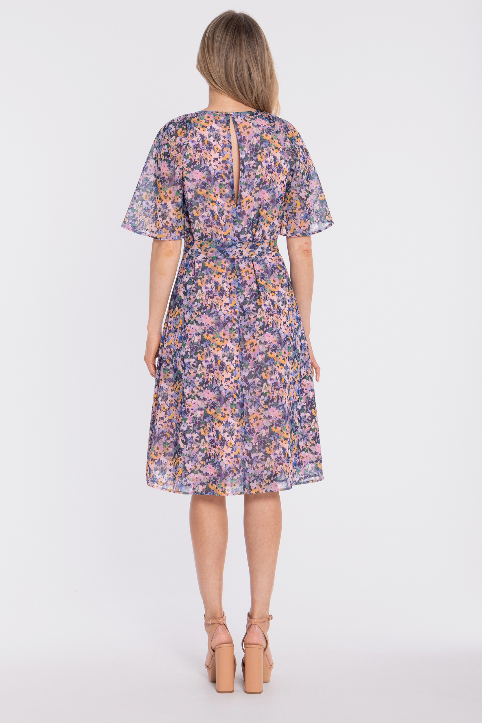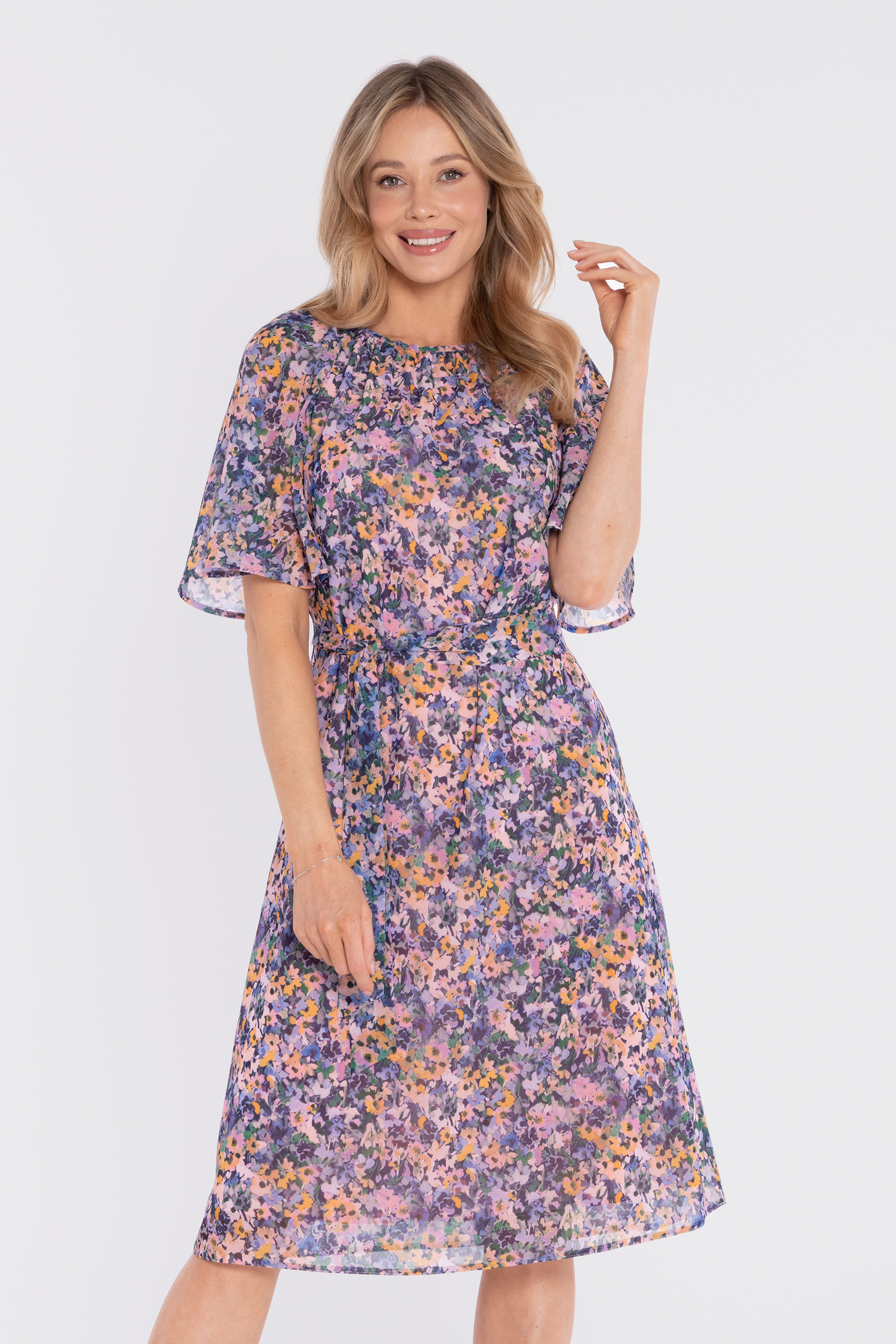 Fason: kobieca sukienka midi z printem, wiązaniem w talii i lekką formą.